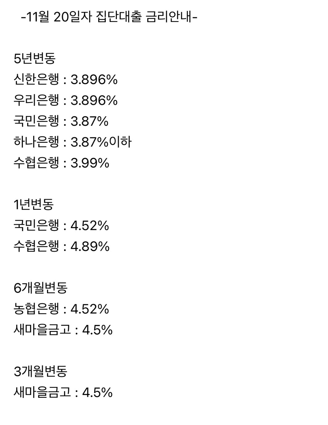 -11월 20일자 집단대출 금리안내-